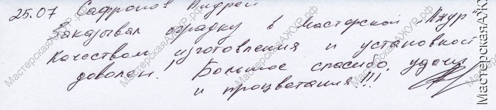 Выражаю благодарность всему коллективу Мастерской "Ажур" за качественно выполненную работу. Заказ был выполнен согласно нашим пожеланиям. Начиная от дизайнера и заканчивая монтажниками, все отнеслись внимательно, учитывая все особенности начальных условий. Спасибо за отличную работу.